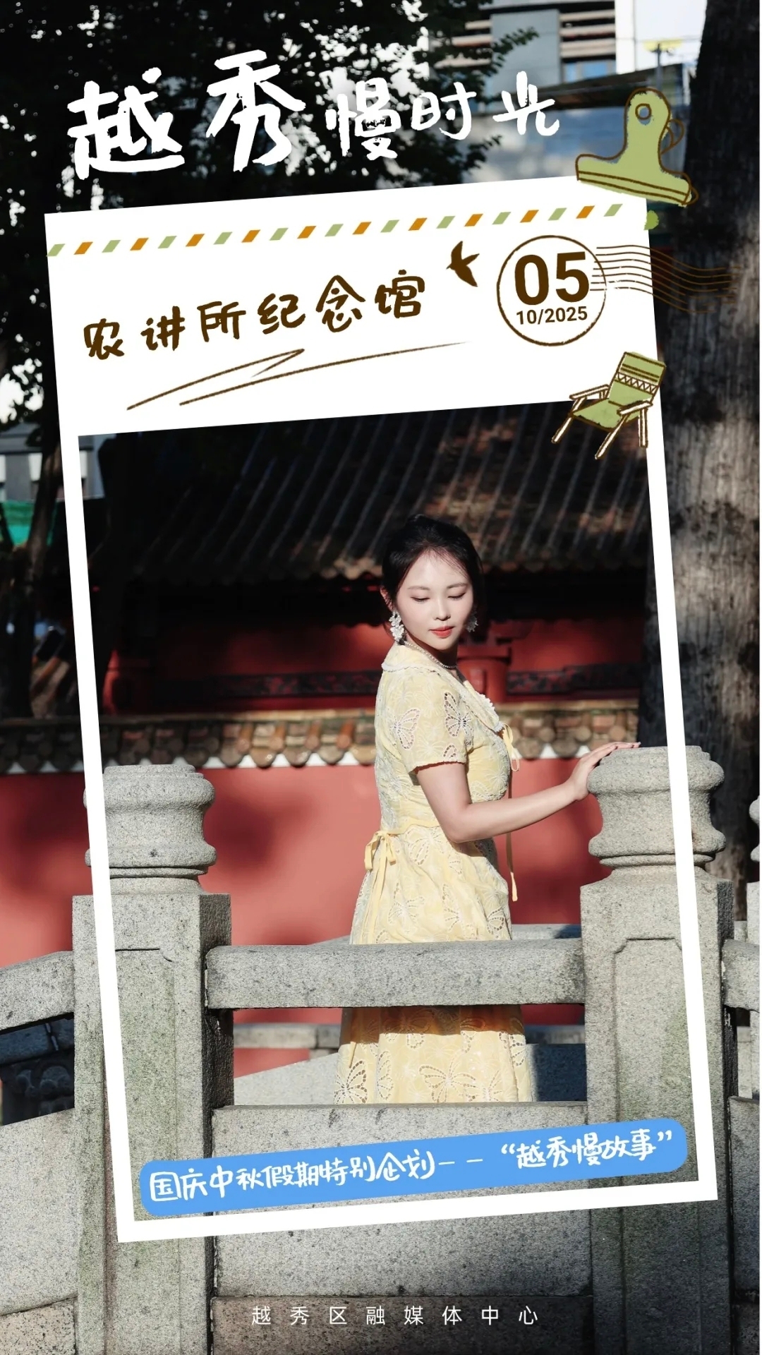 本期主题“越秀慢时光”,让我们一同走进农讲所纪念馆——在这里,大片的红墙黄瓦与葱郁绿植相映,透出浓厚的历史文化韵味。看展、拍照、漫步,把时间调成0.75倍速,享受片刻的宁静。