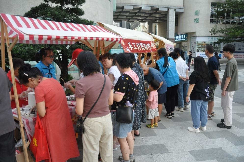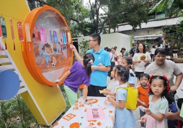 中央花园分会场同时开启热闹的游园会。广绣、灯笼制作等非遗展示区人头攒动。来自光塔街非遗工作室的老师现场教学,不少家庭一起动手,制作中秋灯笼。现场几位快递员小哥也驻足体验,动手尝试制作月饼,感受传统手工艺的魅力。