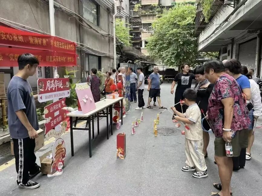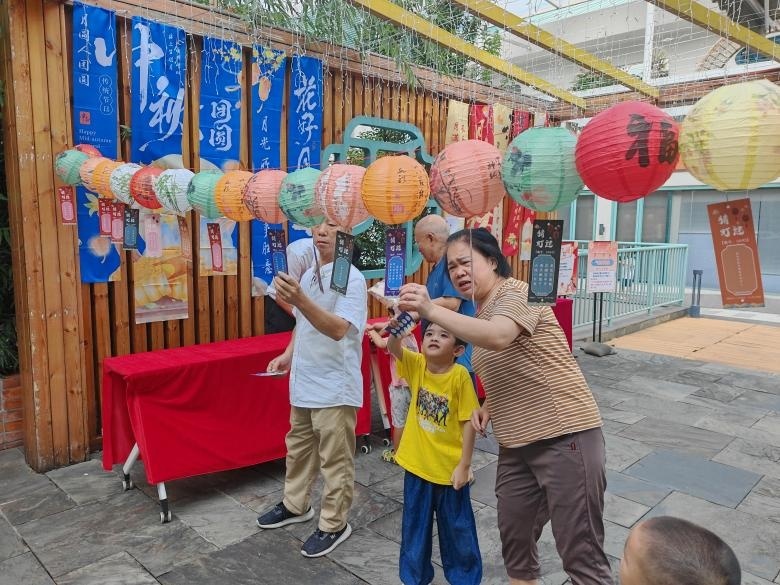 开园仪式结束后,游园活动同步开展,设有投壶、政策宣传、灯笼制作、猜灯谜等互动摊位,街坊们凭游园券参与体验并兑换礼品,在欢声笑语中提前共庆中秋佳节。