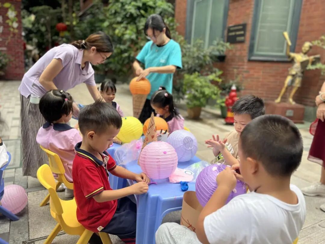 随后,“中秋灯笼亲子共制”环节正式开启。拿到材料后,家长和孩子们立刻投入到灯笼的创作中:有的家庭分工明确,家长负责搭建灯笼骨架,孩子则负责装饰灯笼表面;有的则一起商量设计方案,将中秋元素与创意想法结合。经过一番精心制作,一个个色彩鲜艳、造型独特的中秋灯笼陆续制作完成。